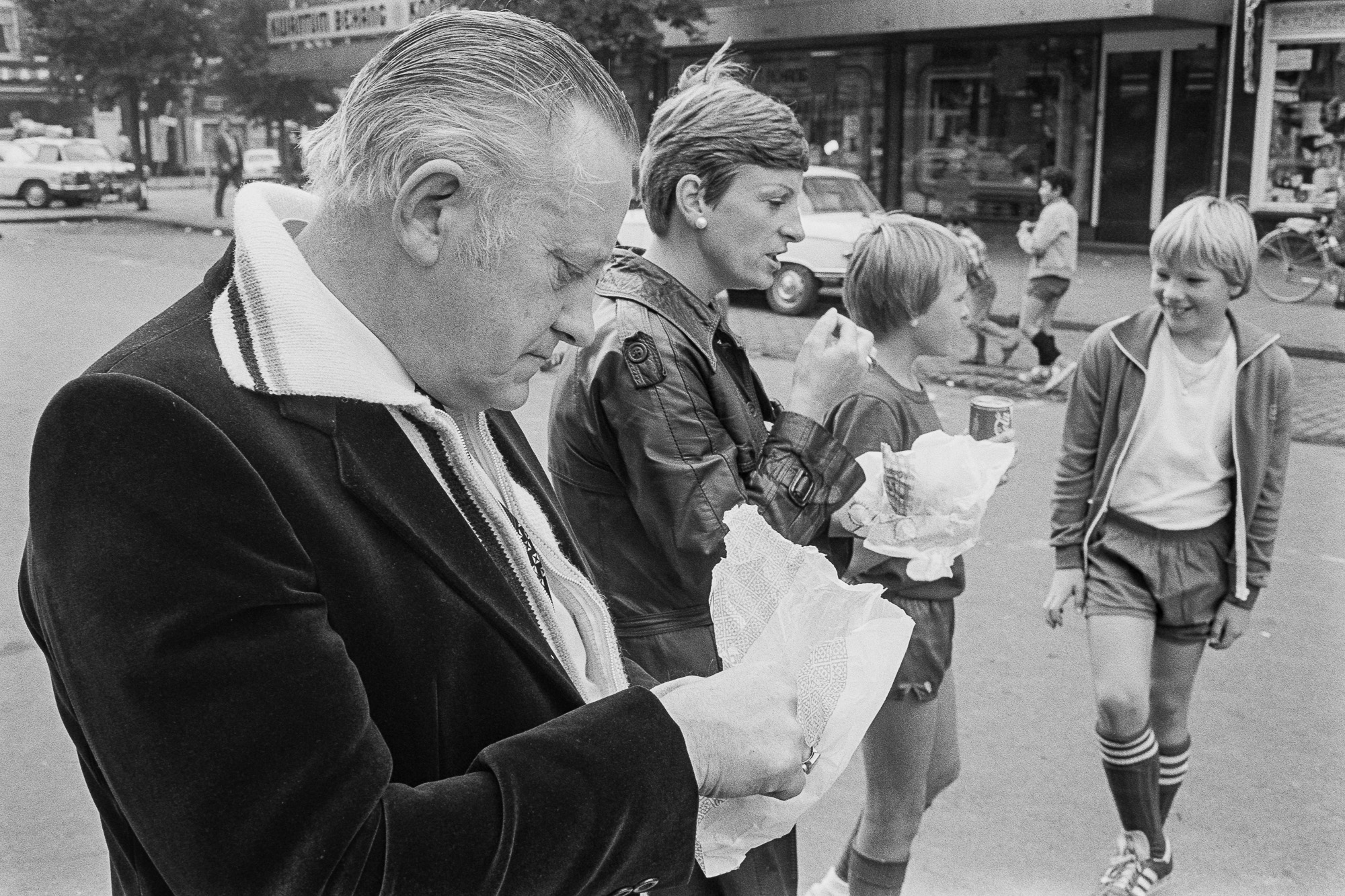 Amsterdam, 29 oktober 1979. Patat eten op straat tijdens een festival in de Dapperbuurt, spelen op straat.