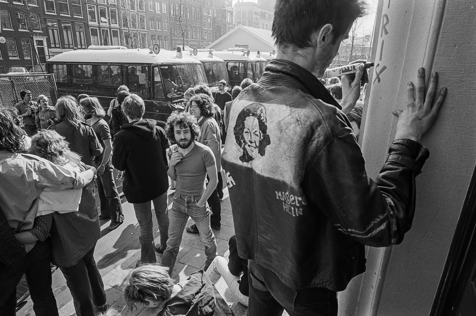 Amsterdam, 17 april 1980. Voorafgaand aan 30 april was er veel onrust in de stad. Hier worden teksten geschreven op het toenmalige gerechtsgebouw aan de Prinsengracht.