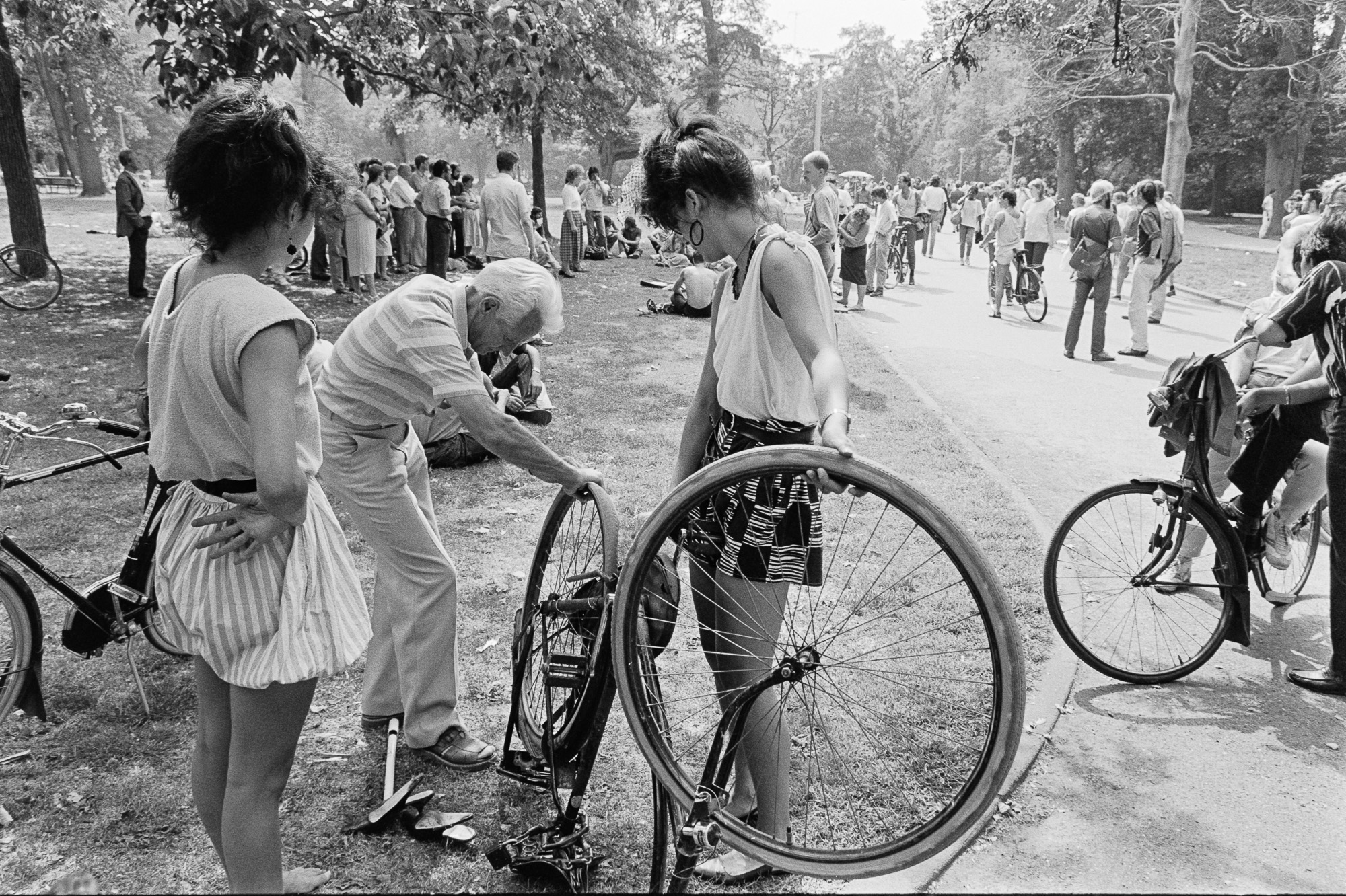 Amsterdam, 31 juli 1983. Vrijmarkt in het Vondelpark., man helpt twee jonge vrouwen met bandenplakken.