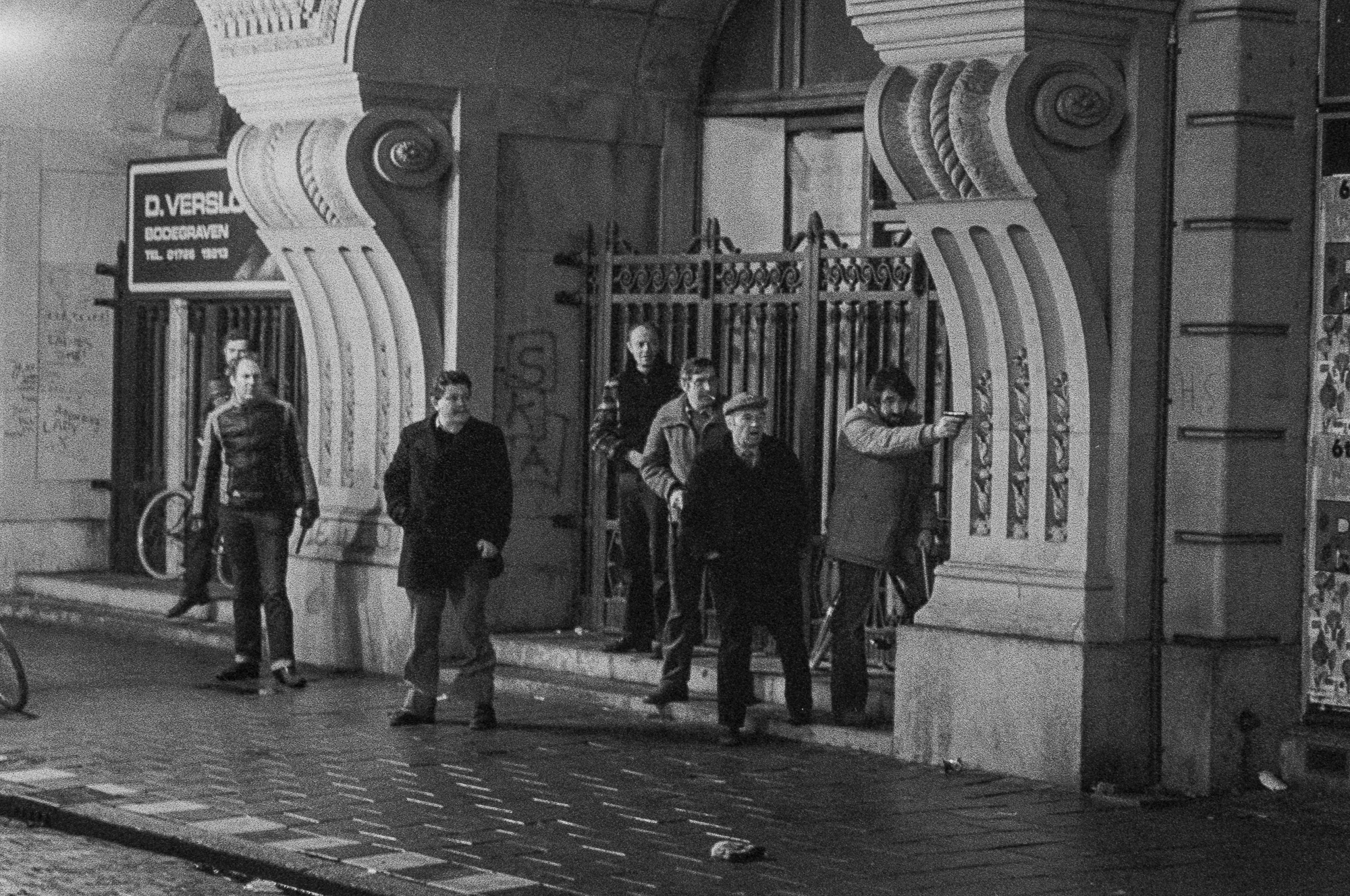 Amsterdam, 2 december 1980. Ook ’s avonds nog ongeregeldheden rond de ontruiming van een gekraakt complex aan de Weteringschans, de recherche zag aanleiding het vuurwapen te trekken, geschoten werd er niet.