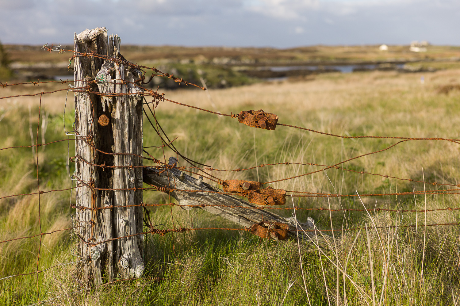 Schotland, 2 juni 2013, Benbecula, een oude houten paal van een hekje met roestende draden en draadspanners.