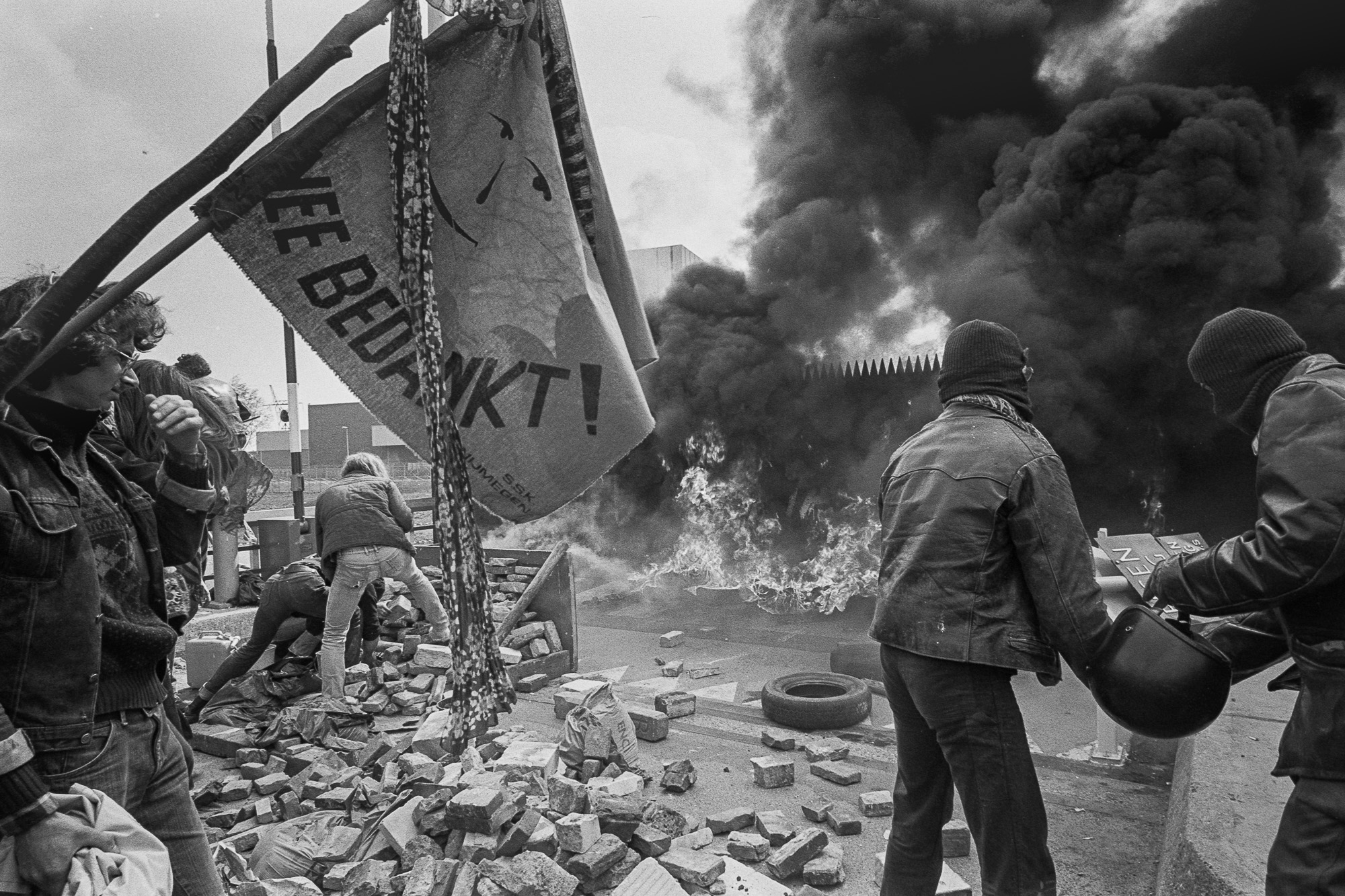 Dodewaard, 20 april 1981, een nogal heftige blokkade van de kerncentrale met rook en vuur.
