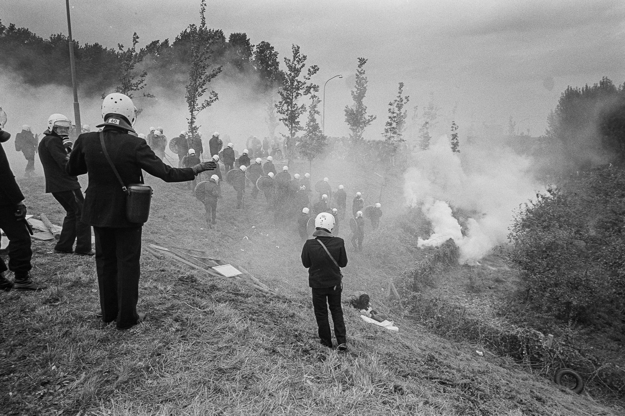 Dodewaard, 19 septemer 1981. Blokkade van de kerncentrale, er werd veel traangas gebruikt om de demnonstranten te verjagen.